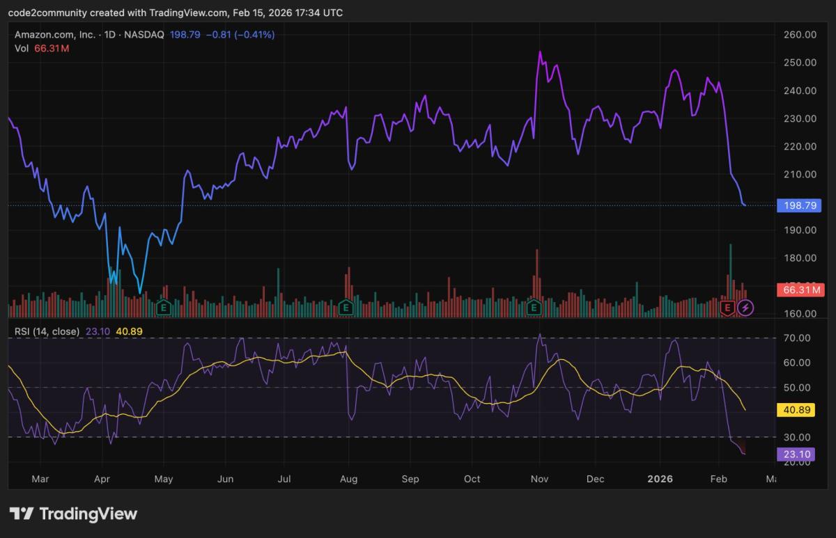 Amazon’s RSI is 23, which is an extreme reading and the lowest level in years. The track record of buying when Amazon’s RSI falls below 30 is compelling. For instance, RSI hit 25 during May 2022 when shares were trading around $115. RSI flirted with 30 in late March 2025 when the tariff tantrum sent the S&P 500 down nearly 20%, dropping Amazon’s share price below $200. Last November, shares peaked near $250.